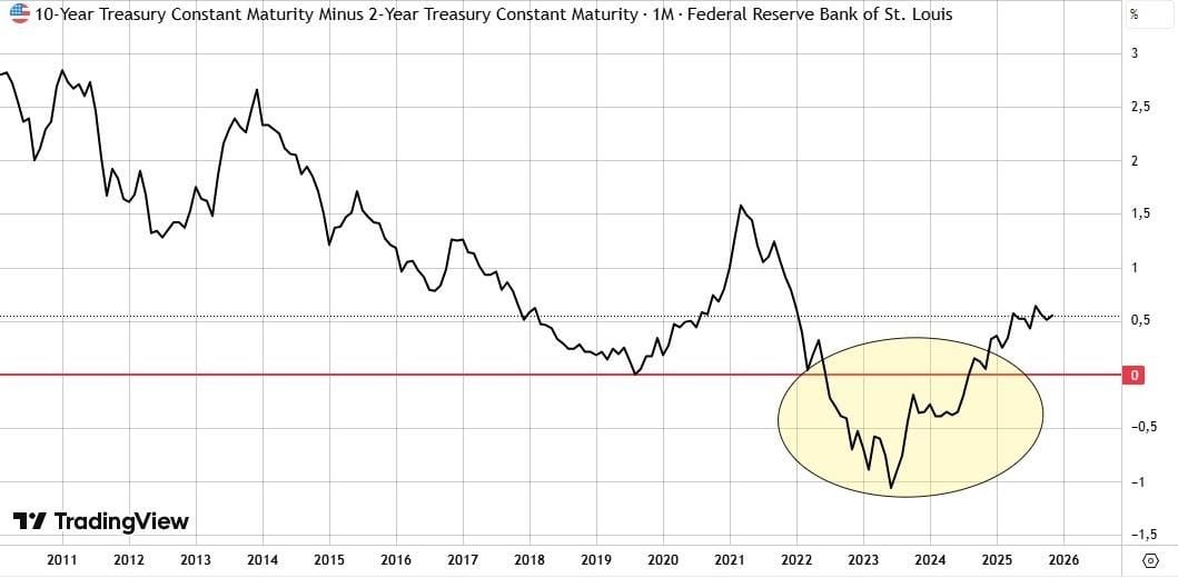 The chart below plots the difference between the 10-Year and 2-Year Treasury yields, with the shaded area representing the period of the yield curve inversion.