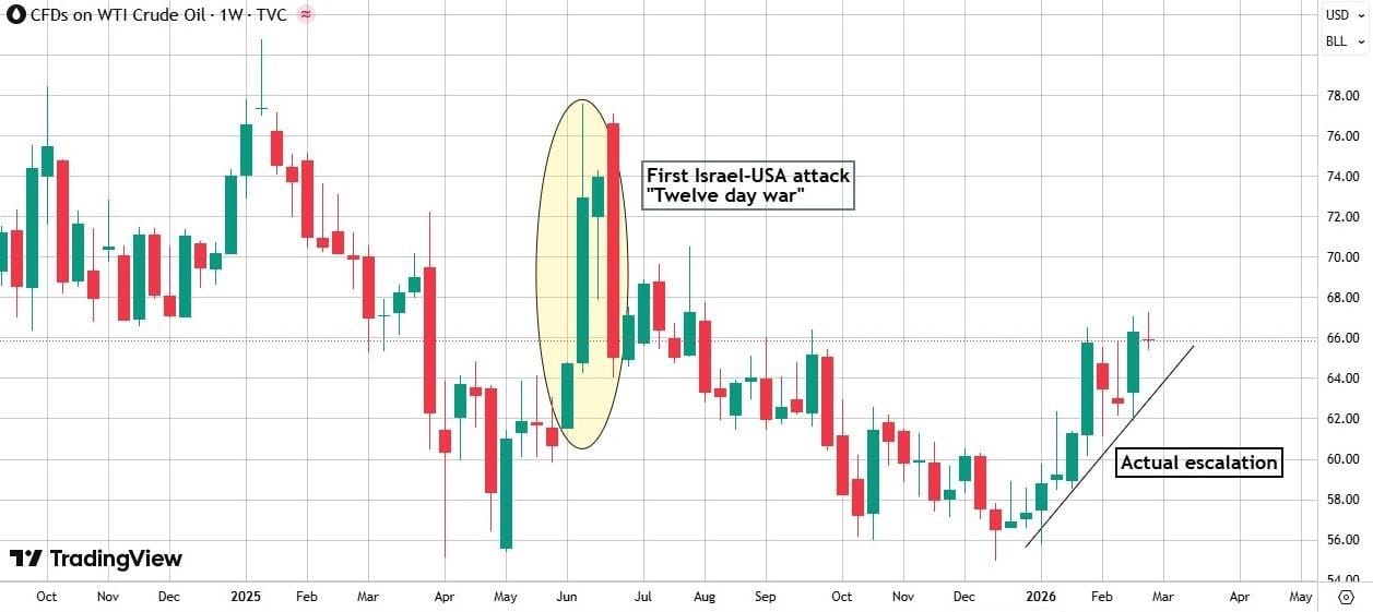 In the CSIS report of February 18 titled “If Trump Strikes Iran,” several escalation scenarios are analysed. In the most severe case, if Iran retaliates following a U.S. strike and manages to keep the Strait of Hormuz closed for weeks, oil prices could rise by more than $90 per barrel. Estimates cited by CSIS from ClearView Energy Partners suggest price impacts of up to $7 per barrel from expanded sanctions, about $13 per barrel from an attack on Kharg Island, and $13–$28 per barrel if the Strait is closed for three to seven days.